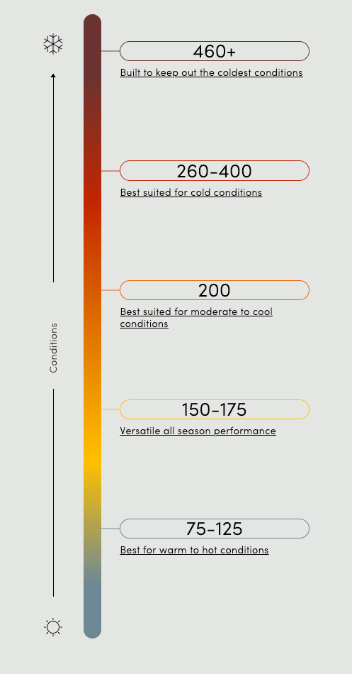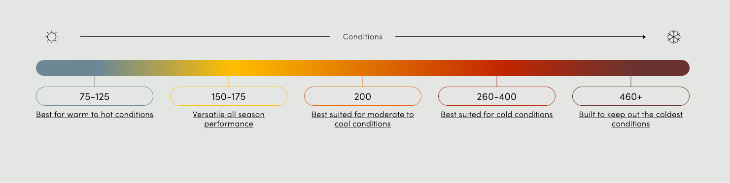 The higher the number, the warmer you'll be. The lower the number, the cooler you’ll be. When choosing your layers, consider in which conditions you plan to use the products, and let yourself be guided by our warmth system.